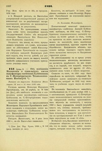 1892. Июня 9. — Об изменении Положения о стипендиях имени мануфактур-советника, Хлебникова в С.-Петербургском Технологическом Институте // Дело Деп. Нар. Просв. 1889 г., № 109 (разр. высших уч. зав.).