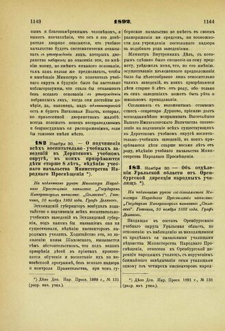 1892. Ноября 30. — О подчинении всех воспитательно - учебных заведений в Дерптском учебном округе в коих призреваются дети старше 8 лет ведению учебного начальства Министерства Народного Просвещения // Дело Деп. Нар. Просв. 1889 г., № 131 (разр. нач. учил.).