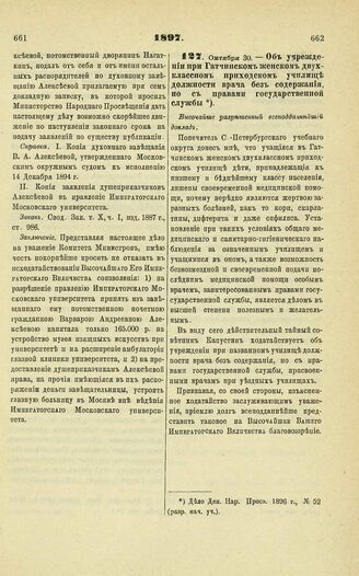 1897. Октября 30. — Об учреждении при Гатчинском женском двухклассном приходском училище должности врача без содержания, но с правами государственной службы. Высочайше разрешенный всеподданнейший доклад // Дело Деп. Нар. Просв. 1896 г., № 52 (разр. нач. уч.).