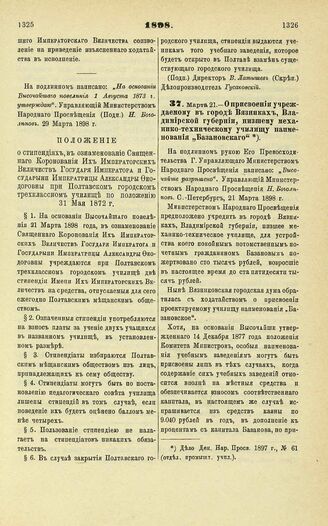 1898. Марта 21. — О присвоении учреждаемому в городе Вязниках, Владимирской губернии низшему механико-техническому училищу наименования «Базановского»