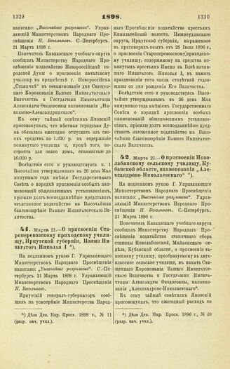 1898. Марта 21. — О присвоении Новолабинскому сельскому училищу, Кубанской области, наименования «Александрово-Николаевского» // Дело Деп. Нар. Просв. 1896 г., № 40 (разр. нач. учил.).