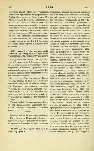 1898. Июня 8. — Об ассигновании кредита на содержание Киренского трехклассного городского училища // Дело Деп. Нар. Просв. 1898 г., № 19 (разр. гор. учил.).