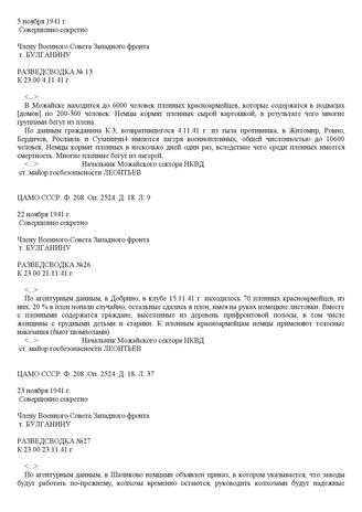 Из разведсводки Можайского сектора НКВД по охране Московской зоны. Разведсводка № 13. 5 ноября 1941 г. // ЦАМО СССР. Ф. 208. Оп. 2524. Д. 18. Л. 9.
