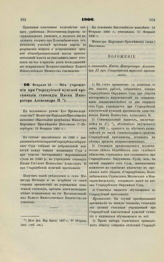 1900. Февраля 12. — Об учреждении при Стародубской мужской прогимназии стипендии Имени Императора Александра II
