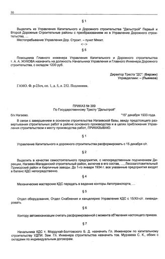 Приказ № 389 по дирекции гостреста «Дальстрой». б/х Нагаево. 15 декабря 1933 г. // ГАМО. Ф. р-23сч, оп. 1, д. 5, л. 331, 332. Подлинник.