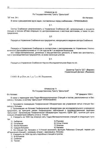 Приказ № 30 по государственному тресту «Дальстрой». б/х Нагаево. 26 января 1934 г.