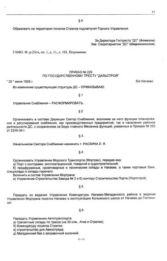 Приказ № 229 по государственному тресту «Дальстрой». б/х Нагаево. 20 июля 1935 г.