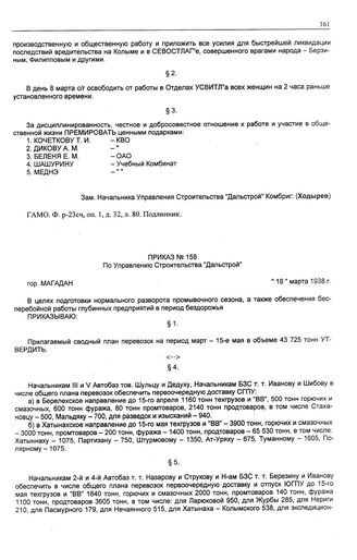 Приказ № 158 по Управлению Строительства «Дальстрой». г. Магадан. 18 марта 1938 г.