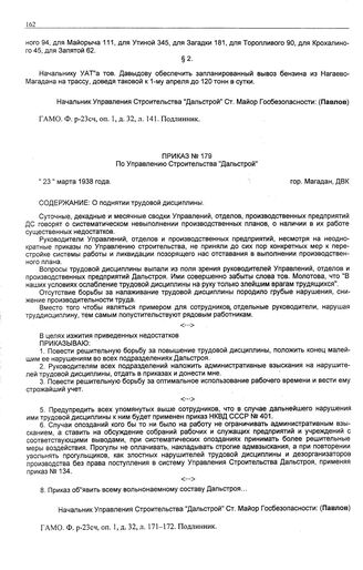 Приказ № 179 по Управлению Строительства «Дальстрой». О поднятии трудовой дисциплины. г. Магадан. 23 марта 1938 г. // ГАМО. Ф. р-23сч, оп. 1, д. 32, л. 171-172. Подлинник.