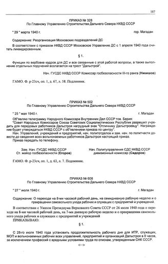 Приказ № 328 по Главному управлению строительства Дальнего Севера НКВД СССР. Реорганизация Московских подразделений ДС. г. Магадан. 29 марта 1940 г. // ГАМО. Ф. р-23сч, оп. 1, д. 67, л. 58. Подлинник.