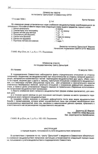 Приказ № 319/419 по государственному тресту «Дальстрой». б/х Нагаево. 13 августа 1934 г.