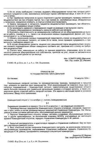 Приказ № 294 по государственному тресту «Дальстрой». б/х Нагаево. 14 августа 1934 г.