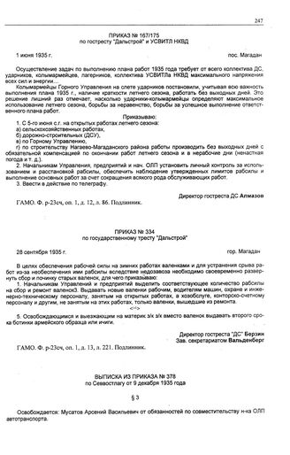 Приказ № 167/175 по гостресту «Дальстрой» и УСВИТЛ НКВД. пос. Магадан. 1 июня 1935 г.