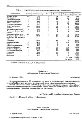 Приказ № 268 по Управлению строительства «Дальстрой». Об удержании за брак с з/к з/к. г. Магадан. 16 апреля 1938 г. // ГАМО. Ф. р-23сч, оп. 1, д. 33, л. 203-204. Подлинник.