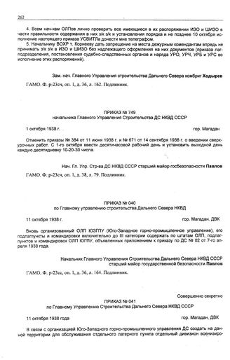 Приказ № 749 начальника Главного Управления строительства ДС НКВД СССР. г. Магадан. 1 октября 1938 г.