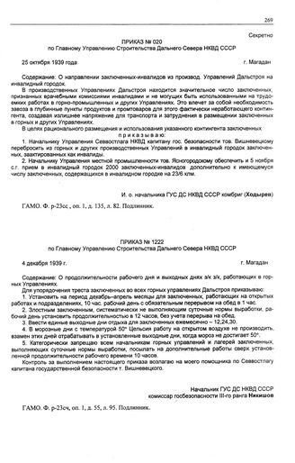 Приказ № 1222 по Главному Управлению строительства Дальнего Севера НКВД СССР. О продолжительности рабочего дня и выходных днях з/к з/к, работающих в горных Управлениях. г. Магадан. 4 декабря 1939 г. // ГАМО. Ф. р-23сч, оп. 1, д. 55, л. 95. Подлинник