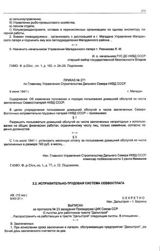 Приказ № 271 по Главному Управлению строительства Дальнего Севера НКВД СССР. Об изменении положения и порядке пользования домашней обслугой из числа заключенных Севвостлагерей НКВД СССР. г. Магадан. 9 июня 1941 г. // ГАМО. Ф. р-23сч, оп. 1, д. 77, л. 52. Подлинник.