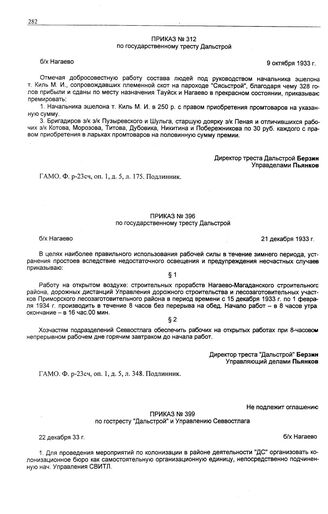 Приказ № 312 по государственному тресту Дальстрой. б/х Нагаево. 9 октября 1933 г. // ГАМО. Ф. р-23сч, оп. 1,д. 5, л. 175. Подлинник.