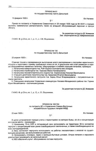 Приказ № 160/164 по гостресту ДС и Управлению Северо-Восточных исправительно-трудовых лагерей НКВД. б/х Нагаево. 25 мая 1935 г. // ГАМО. Ф. р-23сч, оп. 1, д. 12, л. 68. Подлинник.