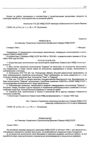 Приказ № 01 по Главному Управлению строительства Дальнего Севера НКВД СССР. О прекращении колонизации заключенных, ликвидации колонпоселков и колонотдела УСВИТЛ НКВД СССР. г. Магадан. 5 января 1940 г. // ГАМО. Ф. р-23сс, оп. 1, д. 149, л. 1. Подлинник