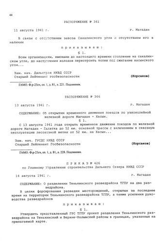 Приказ № 426 по Главному Управлению строительства Дальнего Севера НКВД СССР. О разделении Тенькинского разведрайона ТГПУ на два разведрайона. г. Магадан. 14 августа 1941 г.
