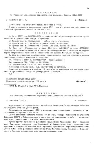 Приказ № 463 по Главному Управлению строительства Дальнего Севера НКВД СССР. г. Магадан. 4 сентября 1941 г.