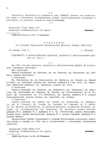 Приказ № 29 по Главному Управлению строительства Дальнего Севера НКВД СССР. О категсрийности приисков, рудников и обогатительных фабрик на 1942 г. г. Магадан. 14 января 1942 г. // ГАМО. Ф.р-23сч, оп. 1, д. 84, л. 69. Подлинник.