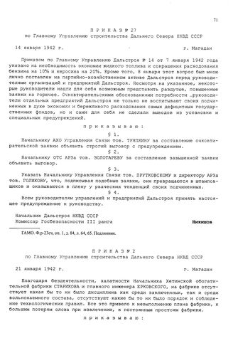 Приказ № 27 по Главному Управлению строительства Дальнего Севера НКВД СССР. г. Магадан. 14 января 1942 г. // ГАМО. Ф.р-23сч, оп. 1, д. 84, л. 64, 65. Подлинник.