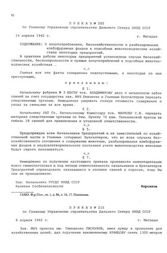 Приказ № 215 по Главному Управлению строительства Дальнего Севера НКВД СССР. г. Магадан. 8 апреля 1942 г. // ГАМО. Ф.р-23сч, оп. 1, д. 86, л. 27. Подлинник.