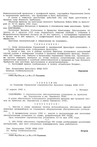 Приказ № 208 по Главному Управлению строительства Дальнего Севера НКВД СССР. О строительстве обогатительных установок на приисках им. Ворошилова и им. Тимошенко ТГПУ. г. Магадан. 16 апреля 1942 г. // ГАМО. Ф.р-23сч, оп. 1, д. 86, л. 419. Подлинник.