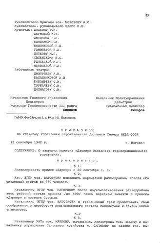 Приказ № 508 по Главному Управлению строительства Дальнего Севера НКВД СССР. О закрытии прииска «Дарпир» Западного горнопромышленного управления. г. Магадан. 12 сентября 1942 г.
