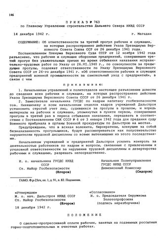 Положение о сдельно-прогрессивной оплате рабочих, занятых на подземных россыпных горно-подготовительных и очистных работах. 18 декабря 1942 г.