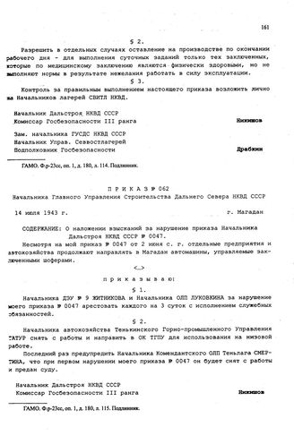 Приказ № 062 Начальника Главного Управления строительства Дальнего Севера НКВД СССР. О наложении взысканий за нарушение приказа Начальника Дальстроя НКВД СССР № 0047. г. Магадан. 14 июля 1943 г.