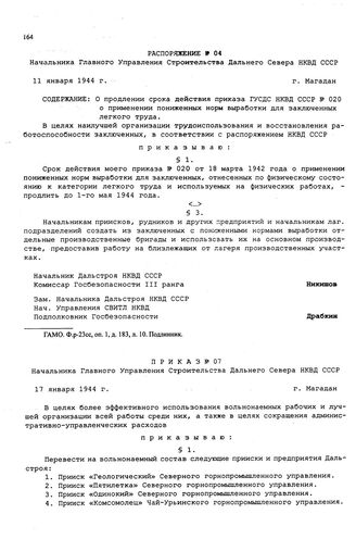 Приказ № 07 Начальника Главного Управления строительства Дальнего Севера НКВД СССР. г. Магадан. 17 января 1944 г.