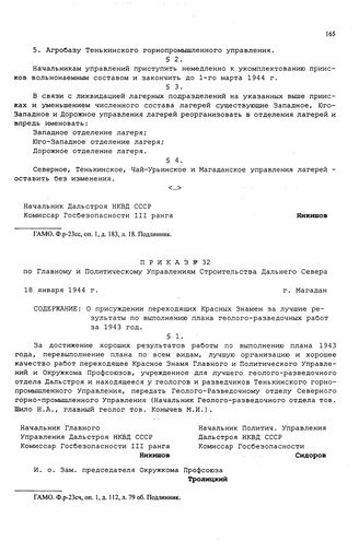 Приказ № 32 по Главному и Политическому Управлениям Строительства Дальнего Севера. О присуждении переходящих Красных Знамен за лучшие результаты по выполнению плана геолого-разведочных работ за 1943 год. г. Магадан. 18 января 1944 г. // ГАМО. Ф.р-23сч, оп. 1, д. 112, л. 79 об. Подлинник.