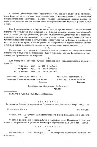 Приказ № 430 Начальника Главного Управления строительства Дальнего Севера НКВД СССР. Об организации Индигирского Горно-Промышленного Управления. г. Магадан. 29 августа 1944 г. // ГАМО. Ф.р-23сч, оп. 1, д. 116, л. 51-50. Подлинник.