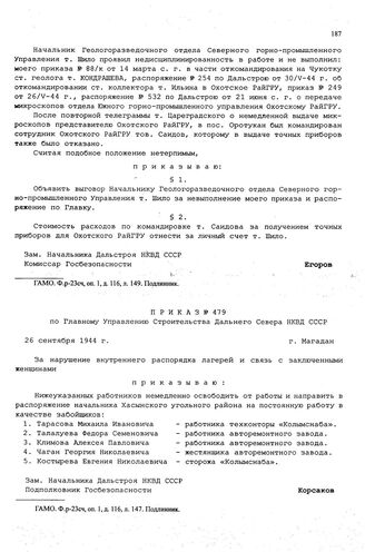 Приказ № 479 по Главному Управлению строительства Дальнего Севера НКВД СССР. г. Магадан. 26 сентября 1944 г.
