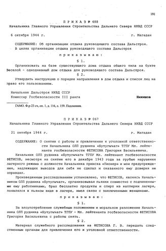 Приказ № 488 Начальника Главного Управления строительства Дальнего Севера НКВД СССР. Об организации отдыха руководящего состава Дальстроя. г. Магадан. б октября 1944 г. // ГАМО. Ф.р-23 сч, оп. 1, д. 116, л. 159. Подлинник.