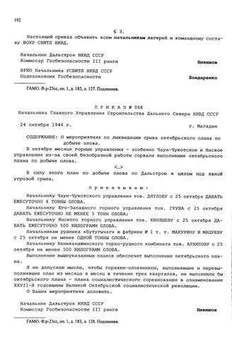 Приказ № 068 Начальника Главного Управления строительства Дальнего Севера НКВД СССР. О мероприятиях по ликвидации срыва октябрьского плана по добыче олова. г. Магадан. 24 октября 1944 г. // ГАМО. Ф.р-23сс, оп. 1, д. 183, л. 128. Подлинник.