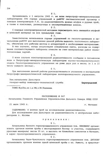 Распоряжение № 047 Начальника Главного Управления строительства Дальнего Севера НКВД СССР. О взятии проб на исследование радиоактивности. г. Магадан. 21 июля 1945 г.