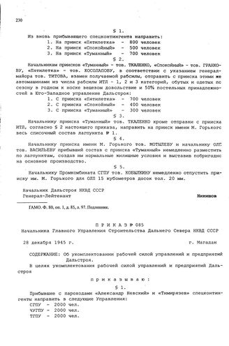 Приказ № 085 Начальника Главного Управления строительства Дальнего Севера НКВД СССР. Об укомплектовании рабочей силой управлений и предприятий Дальстроя. г. Магадан. 28 декабря 1945 г.