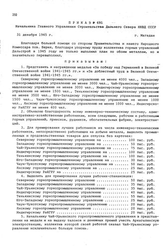 Приказ № 691 Начальника Главного Управления строительства Дальнего Севера НКВД СССР. г. Магадан. 31 декабря 1945 г.