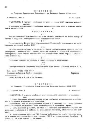 Приказ № 095 по Главному Управлению строительства Дальнего Севера НКВД СССР. О нормах снабжения вольнонаемного населения и заключенных. г. Магадан. 22 августа 1941 г.
