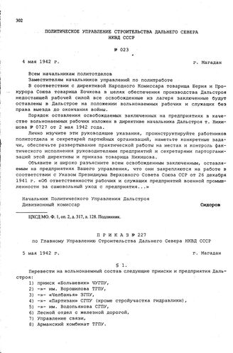 Приказ № 227 по Главному Управлению строительства Дальнего Севера НКВД СССР. г. Магадан. 5 мая 1942 г.