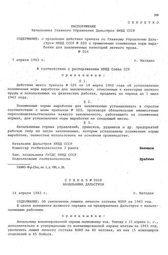 Распоряжение Начальника Главного Управления Дальстроя НКВД СССР. О продлении действия приказа по Главному Управлению Дальстроя НКВД СССР № 020 о применении пониженных норм выработки для заключенных категорий легкого труда. г. Магадан. 7 апреля. 1943 г. // ГАМО. Ф.р-23сс, оп. 1, д. 180, л. 26.