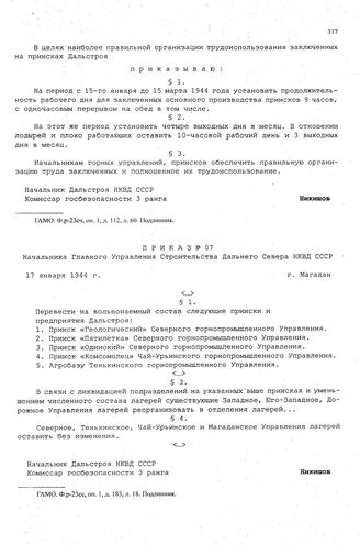 Приказ № 07 Начальника Главного Управления строительства Дальнего Севера НКВД СССР. г. Магадан. 17 января 1944 г. // ГАМО. Ф.р-23сс, оп. 1, д. 183, л. 18. Подлинник.