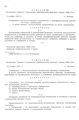 Приказ № 566 Начальника Главного Управления строительства Дальнего Севера НКВД СССР. О производственно-техническом обучении заключенных. г. Магадан. 10 ноября 1944 г.