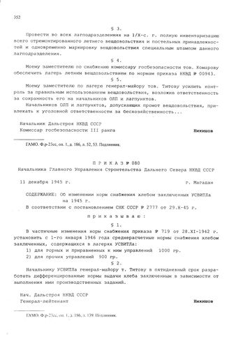 Приказ № 080 Начальника Главного Управления строительства Дальнего Севера НКВД СССР. Об изменении норм снабжения хлебом заключенных УСВИТЛа на 1945 г. г. Магадан. 11 декабря 1945 г. // ГАМО. Ф.р-23сс, оп. 1. д. 186, л. 139. Подлинник.