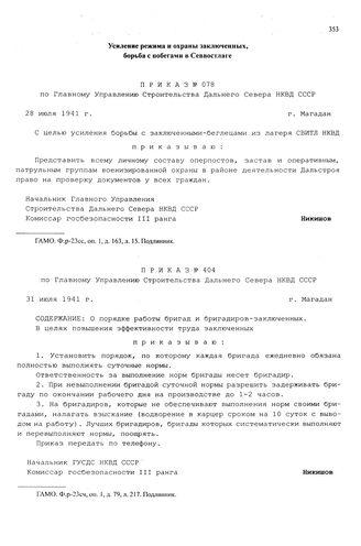 Приказ № 078 по Главному Управлению строительства Дальнего Севера НКВД СССР. г. Магадан. 28 июля 1941 г. // ГАМО. Ф.р-23сс, оп. 1, д. 163, л. 15. Подлинник.