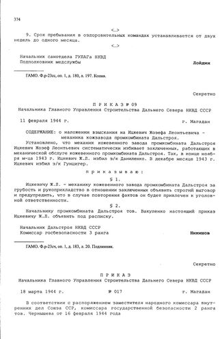 Приказ № 09 Начальника Главного Управления строительства Дальнего Севера НКВД СССР. О наложении взыскания на Ицкевич Жозефа Леонтьевича - механика кожзавода промкомбината Дальстроя. г. Магадан. 11 февраля 1944 г. // ГАМО. Ф.р-23сч, оп. 1, д. 183, л. 20. Подлинник.
